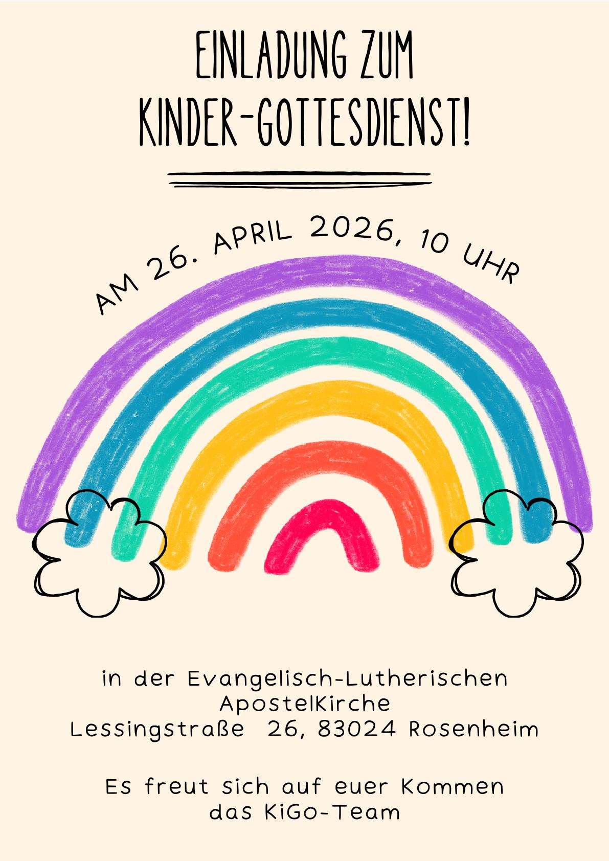 Kindergottesdienst Sonntag, 26. April 2026, 10 UhrApostelkirche Ansprechperson: Pfarrerin Claudia Huber claudia.huber@elkb.de 08031 892067 Einladung zum Kindergottesdienst. 26.04.2026 10 Uhr Apostelkirche Wir freuen uns auf euer Kommen. Euer KiGo-Team