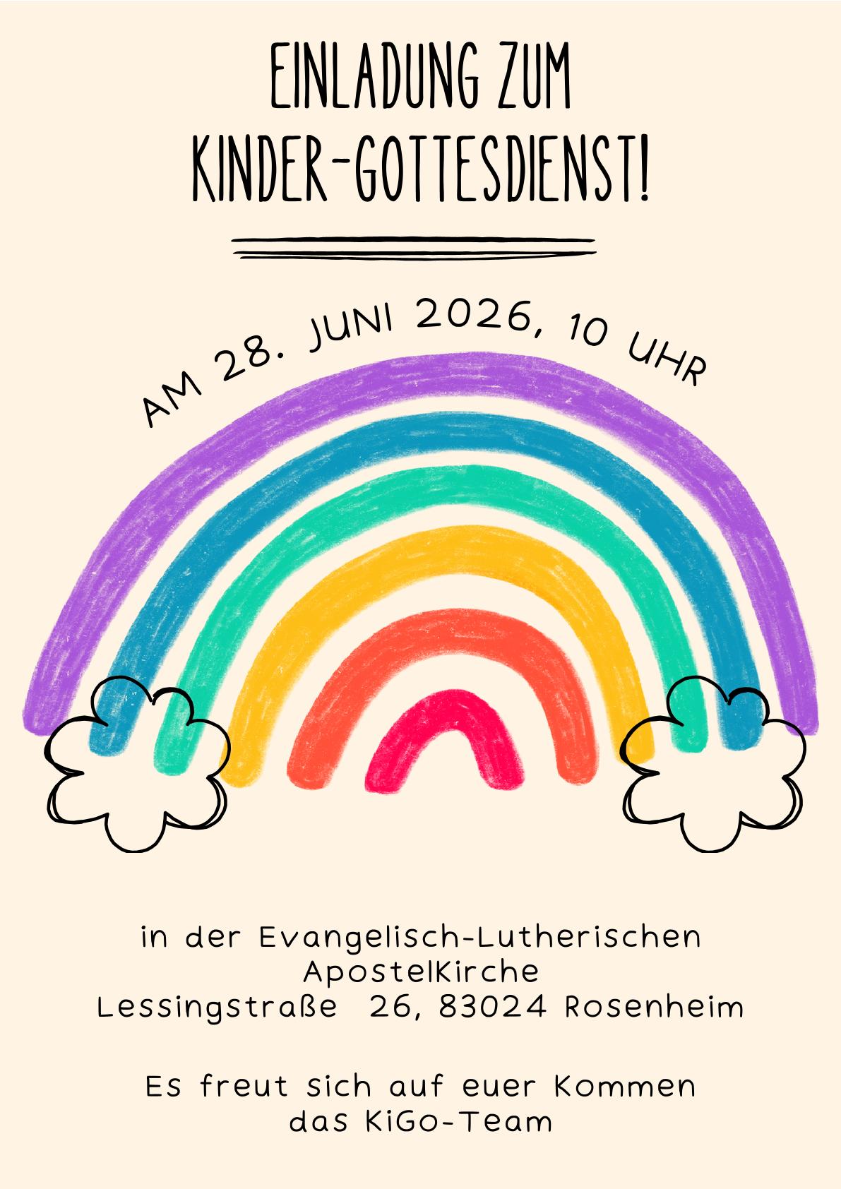 Kindergottesdienst Sonntag, 28. Juni 2026, 10 UhrApostelkirche Ansprechperson: Pfarrerin Claudia Huber claudia.huber@elkb.de 08031 892067 Einladung zum Kindergottesdienst. 28.06.2026 10 Uhr Apostelkirche Wir freuen uns auf euer Kommen. Euer KiGo-Team