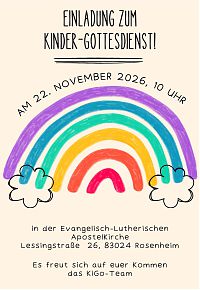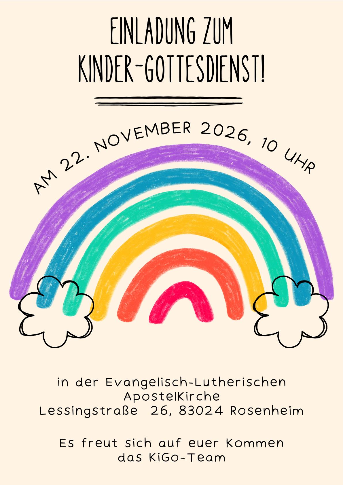 Kindergottesdienst Sonntag, 22. November 2026, 10 UhrApostelkirche Ansprechperson: Pfarrerin Claudia Huber claudia.huber@elkb.de 08031 892067 Einladung zum Kindergottesdienst. 22.11.2026 10 Uhr Apostelkirche Wir freuen uns auf euer Kommen. Euer KiGo-Team