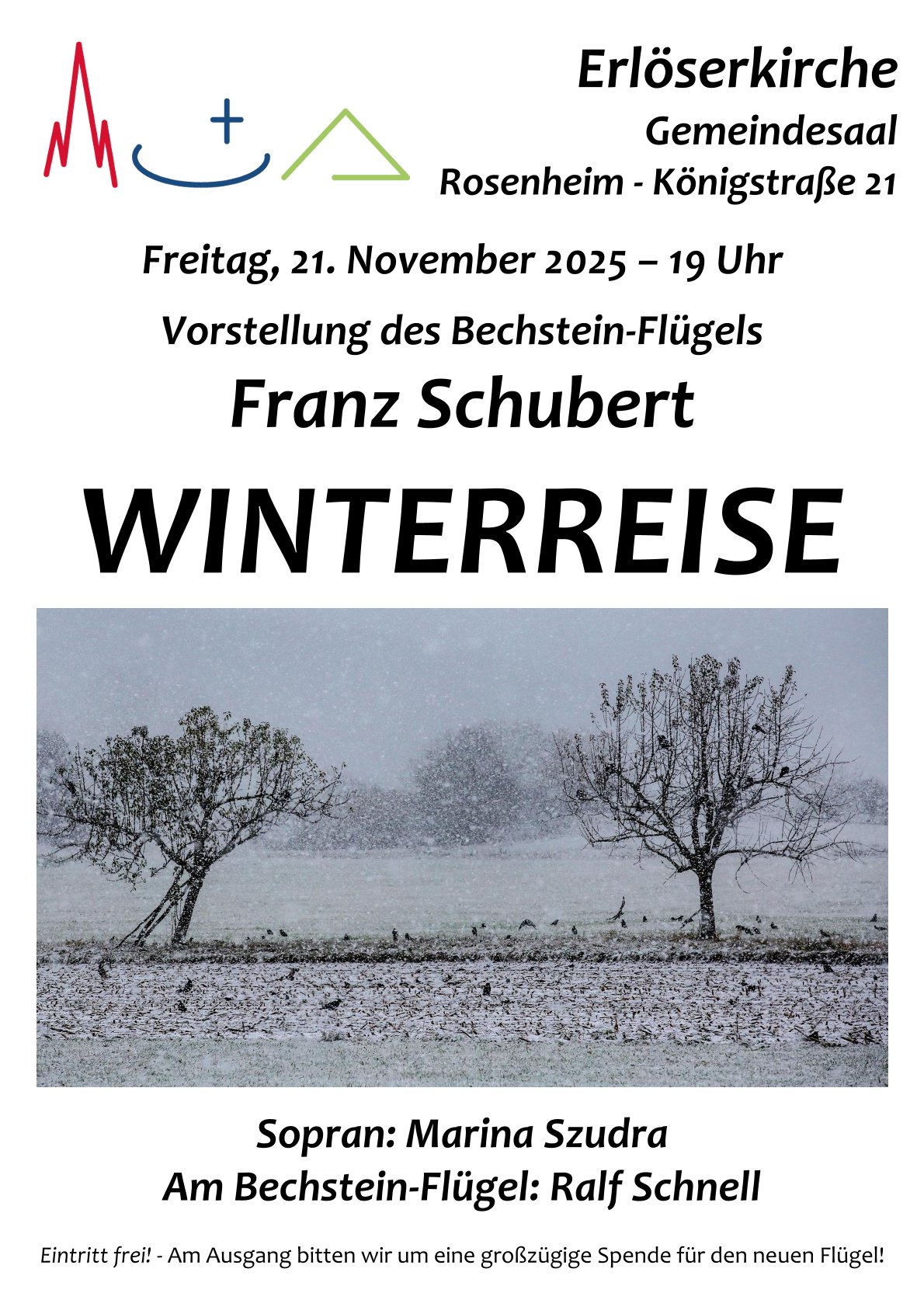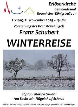 Klavier-Konzert "Schuberts Winterreise" Freitag, 21. November 2025, 19 UhrGemeindehaus Erlöserkirche Königstraße 23 b 83022 Rosenheim Ansprechperson: Pfarrerin Rosemarie Rother rosemarie.rother@elkb.de 08031 61309 Franz Schubert: Winterreise Sopran: Marina Szudra Am Bechstein-Flügel: Ralf Schnell Eintritt frei! – Am Ausgang bitten wir um eine großzügige Spende für den neuen Flügel