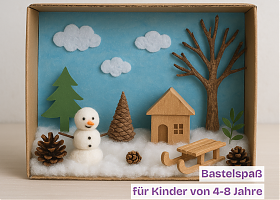 Wir gestalten gemeinsam eine kleine Winterlandschaft in einem Schuhkarton. Mit viel Fantasie, verschiedenen Materialien und kreativen Ideen entstehen ganz persönliche Mini-Winterwelten zum Mitnehmen.